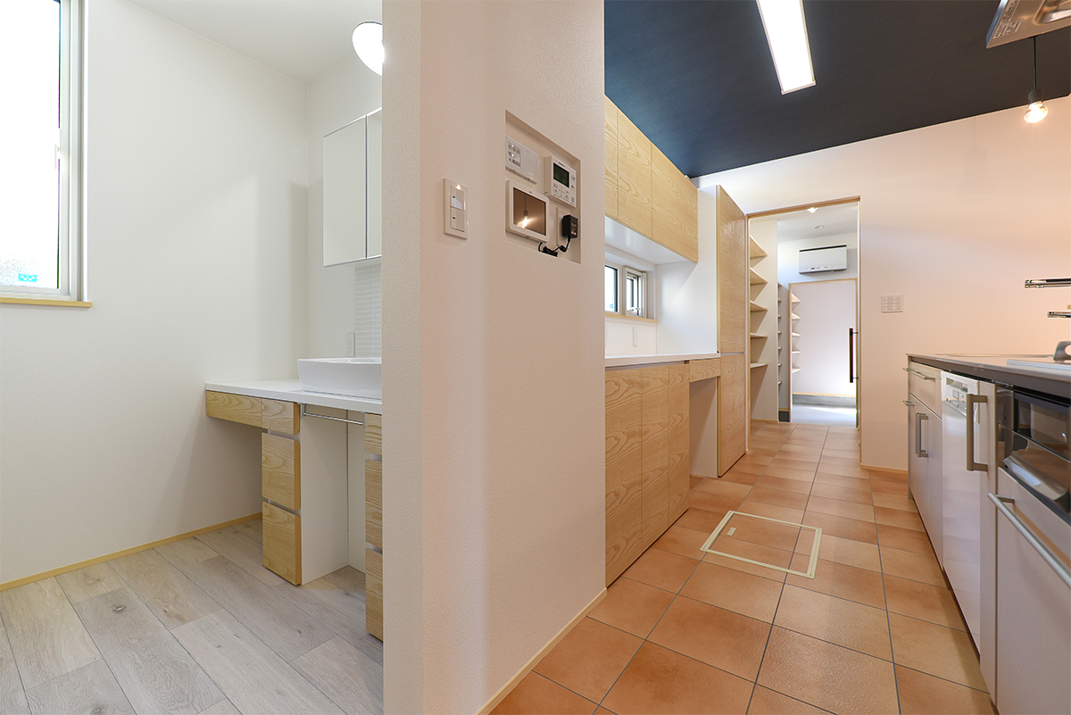 ▶家事楽プラン…16m真っ直ぐ続く動線の中に様々な家事動線と収納を組み込みました。帰宅してから、直線の動きの中ですぐに家事に取り掛かることができて、料理と洗濯のスムーズな同時進行が可能になりました。