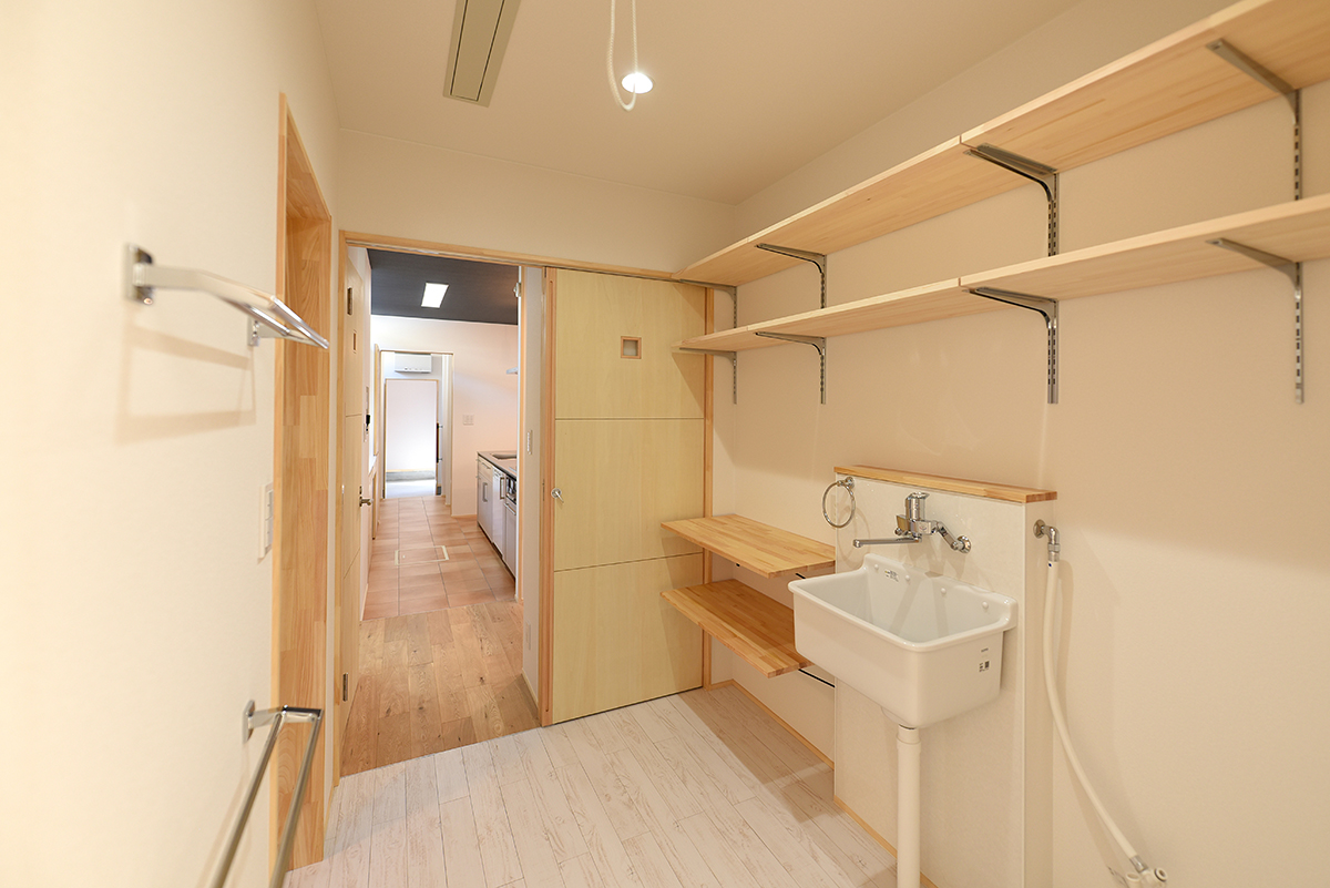 キッチンから続くサニタリースペースには靴洗いや汚れ物洗いに便利なスロップシンクを備え付けました。