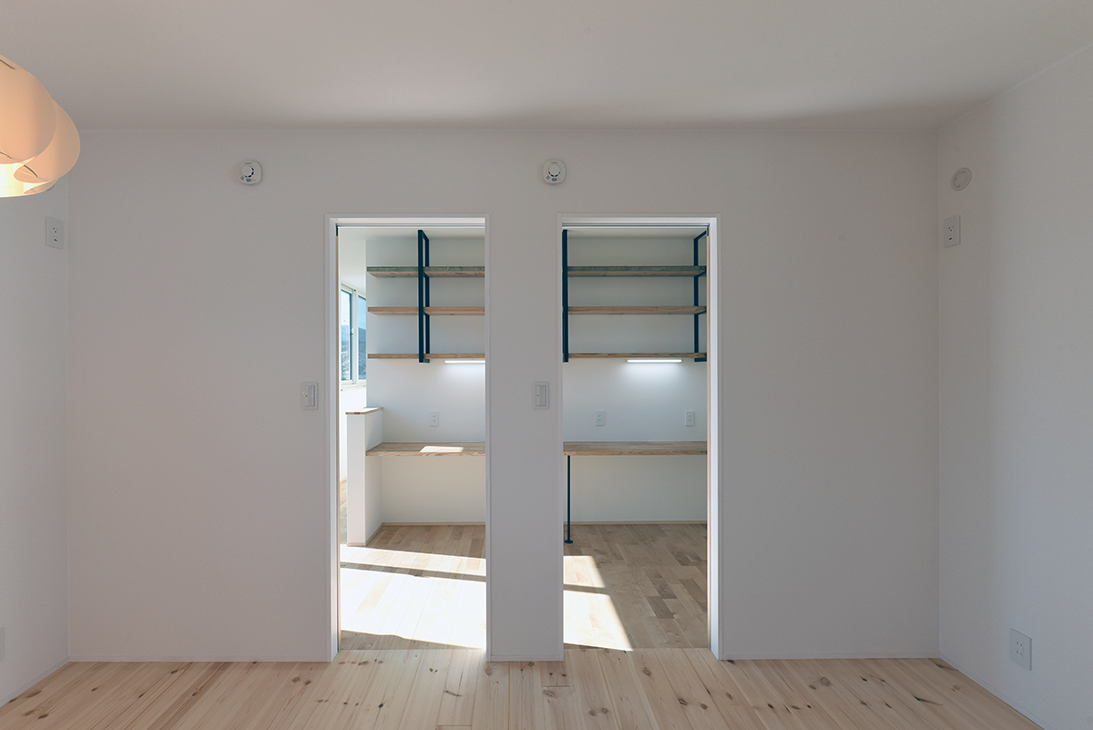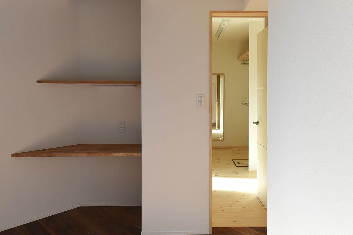 壁紙側から子供部屋入り口方向。ドアの向こうにお子さん共用のスタディスペース。