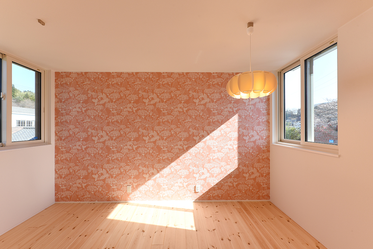 お子さん二人で使用予定の部屋。壁紙も照明もすこぶる可愛らしい。
