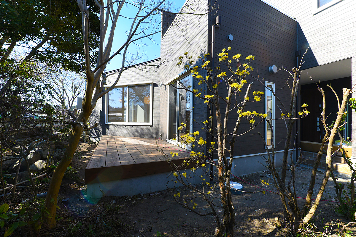 くの字の部分には和室から出入りできるウッドデッキ。