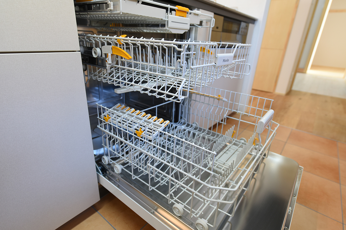 フライパンも洗える幅60cmのミーレ社の大型食洗機。6人家族でも1回で食器洗い完了。