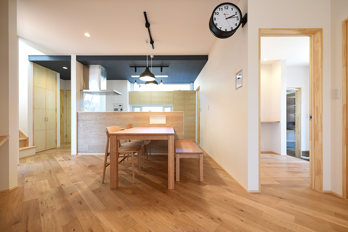 ダイニングキッチン。両サイドから出入りできるキッチンも家事楽ポイント高し。右手が玄関。