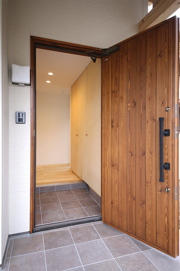 外観の雰囲気をぐっと高める重厚な木製玄関ドア。