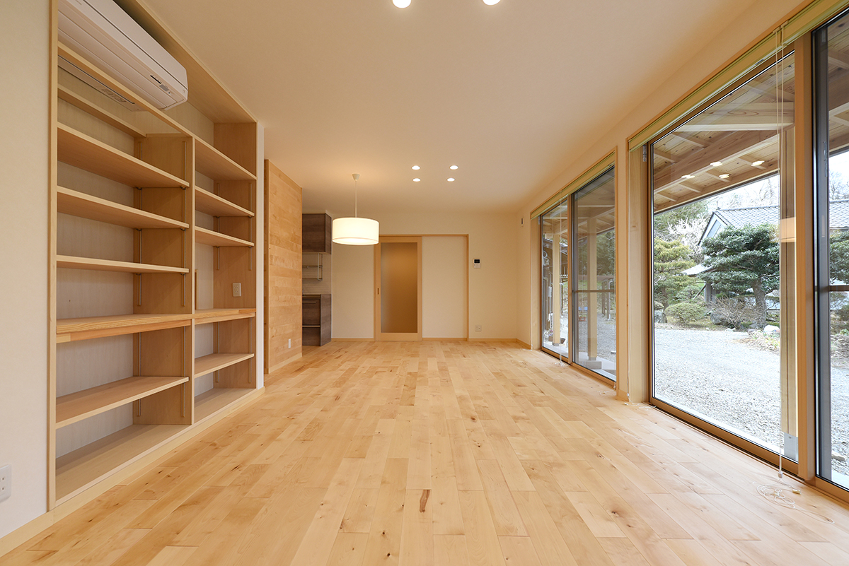 東京からいわきへUターンされたご夫婦と子どもさんの、3人家族が暮らすためのお住いです。当初は母屋のリフォームも検討しましたが、費用対効果とお互いの暮らし方を検討した結果、ご実家の母屋と大紅葉の間にあった離れを解体し、新しい家を建築しました。