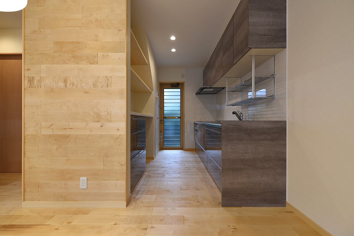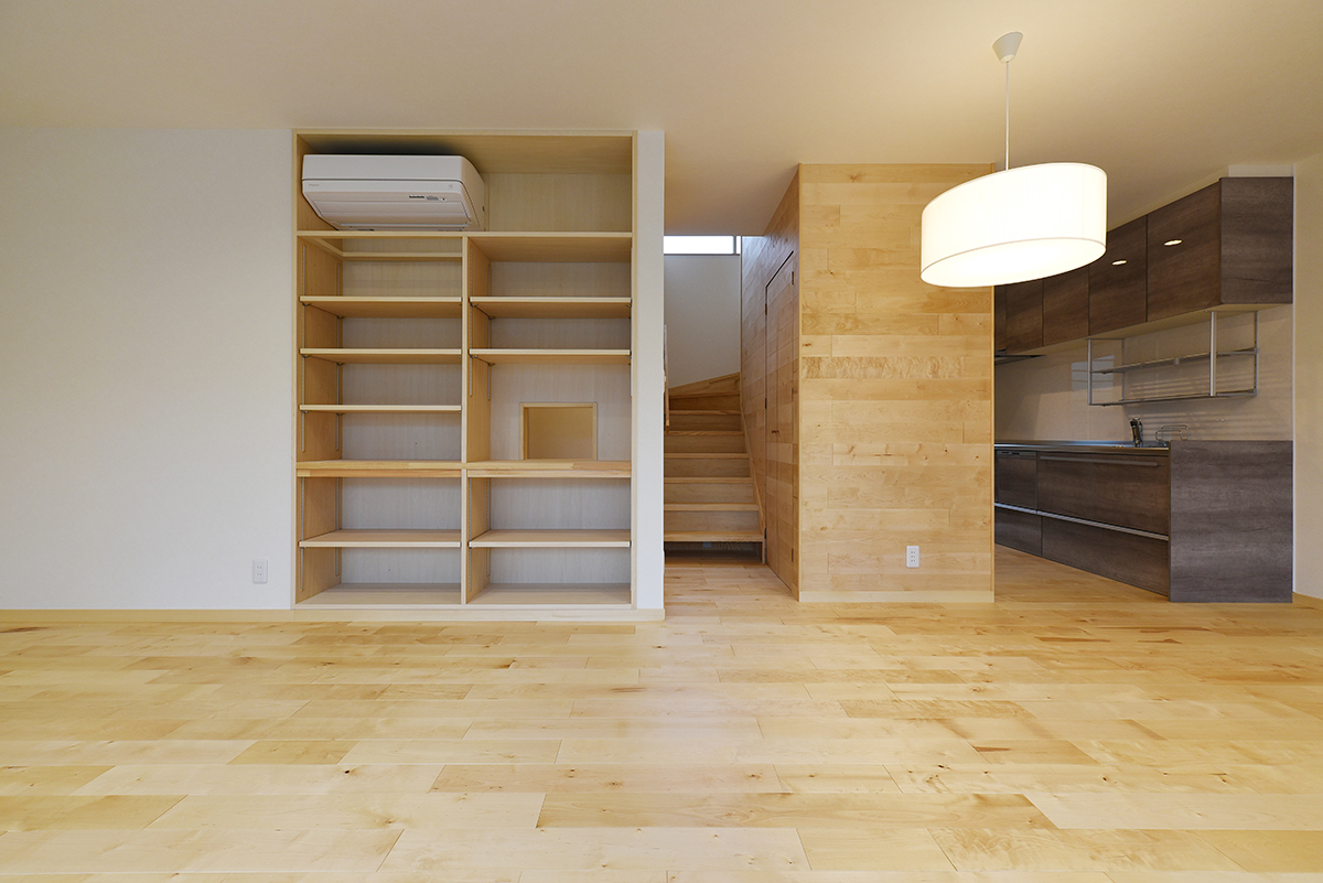 壁材の一部を床材と同じにすることで、部屋の広がりを演出しています。棚の中の小窓は、熱帯魚の水槽を棚奥の廊下側からも見えるように開いています。
