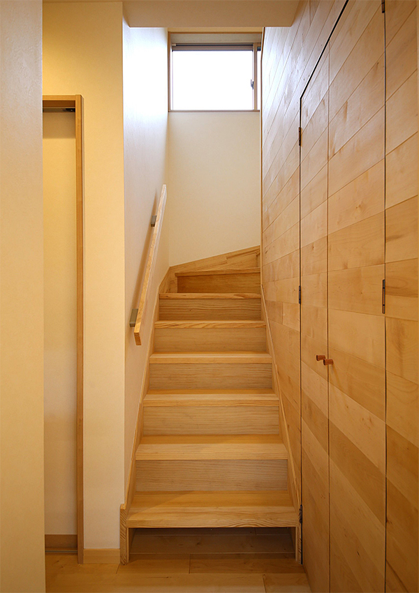 階段脇の壁も床材を仕様。扉部分は大工さん泣かせだったようです。