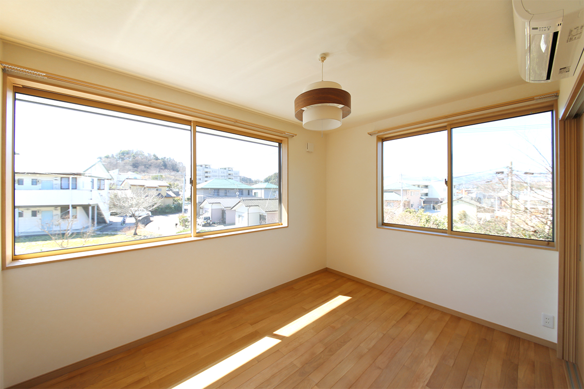 開けた眺望を取り入れられるよう、南面と西面に窓を大きく取った子供部屋。