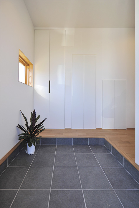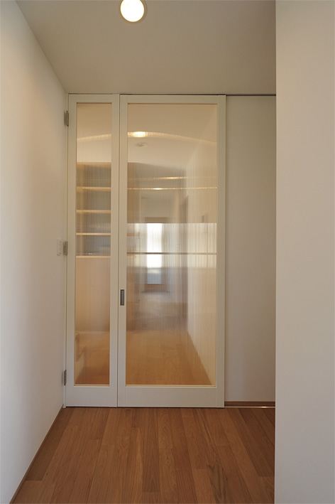 35坪の中に無駄なく収納を配置(写真左)。玄関とリビングの間の白の建具がお洒落感アップ(写真右)。