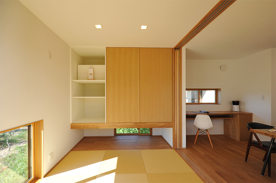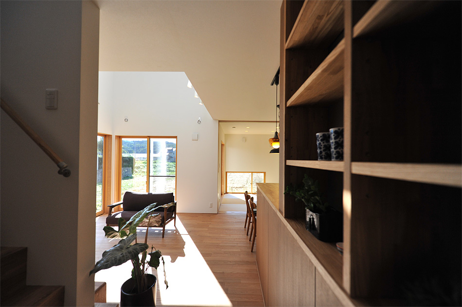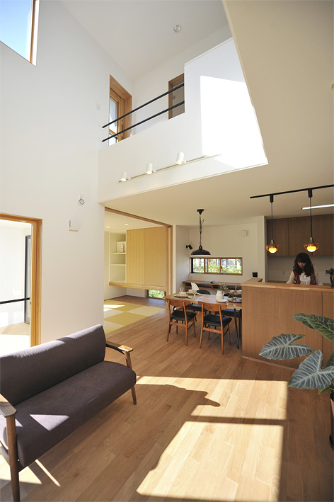 ダイニングと和室は落ち着いた高さと暗さ。リビングは吹き抜けの開放感と前庭からの光で明るい空間。その光と影、高さと低さが住宅に奥行きをもたらし、季節や時間によって違う雰囲気を作り出してくれます。小さな変化のように思えますが、実際に暮らしてみると、家に「表情」をもたらしていることが感じられます。