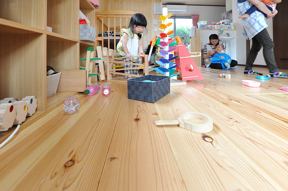 床材は地元の杉「あつ密すぎ」。傷は付きやすいけど、素足の子供たちには柔らかさのある最高の感触。湿気の多いこの時期も足裏はベタベタしません。