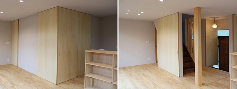 写真は、引戸の大きさを天井高さまでとすることで、扉を開いた時にも壁の一部に感じられるデザインとしています。開き戸の場合は、邪魔になりにくいドアストッパーをつけ、ドアを開いても邪魔になりにくいプランづくりを検討ください。