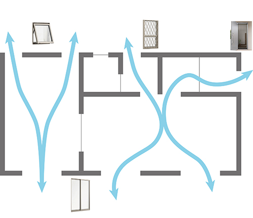 昔から同じ場所に住んでいる人は、季節ごとにどの方向へ風が流れるか熟知している人が少なくありません。新しい家に住んでみて、風の流れを理解してきたら、効果的に風の入口と出口、2か所以上の窓を同時に開けることが効果的な通風獲得策です。