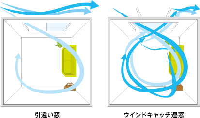 縦すべり出し窓は、窓を屋外側へ開き出すため、風向きにより流れる風を受け止め室内へ取り込みやすいという点があります。ウインドキャッチ連窓という、風の流れを取り込むことを意識した窓商品もあります。