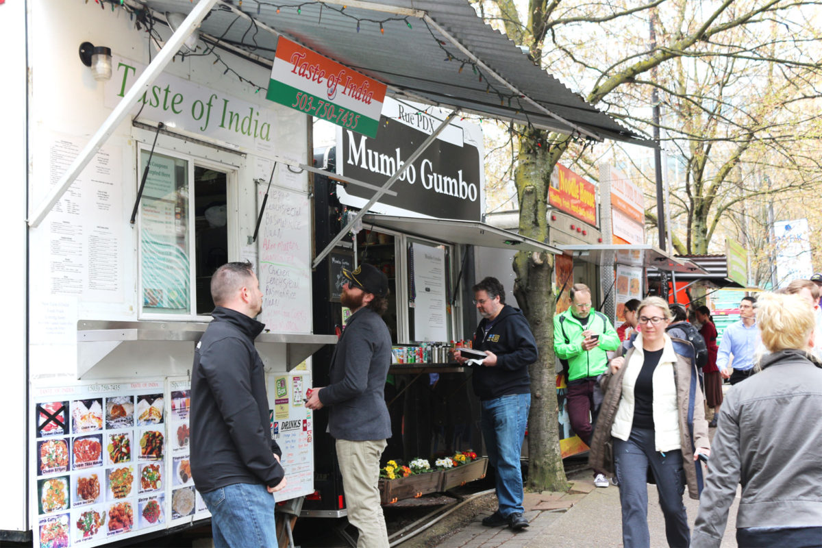ランチは、街の中心にあつまるフードカーで。アジアから南米、アメリカンまで多国籍なお店が並ぶ。