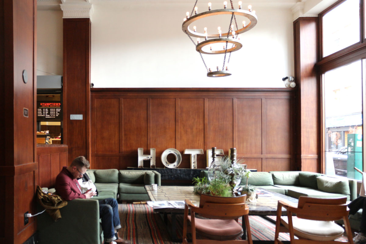 ホテルには、ポートランド発でサードウェーブコーヒーブームの火付け役となった「Stumptown Coffee Roasters」が併設されていて、皆がコーヒー片手に時間を過ごす。