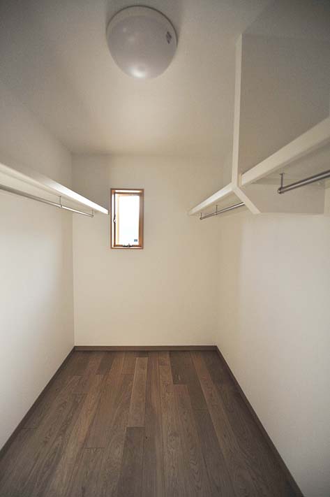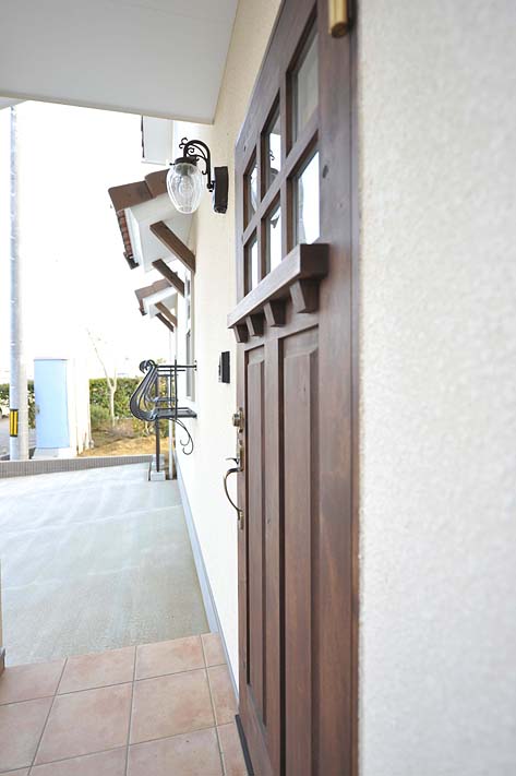 主寝室から続くウォークインクローゼット(写真左)。玄関ドアも輸入建具。ロートアイアンの花台の上には奥様のご要望で花を傷めないように小屋根がついています(写真右)。