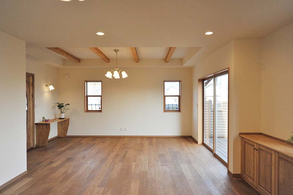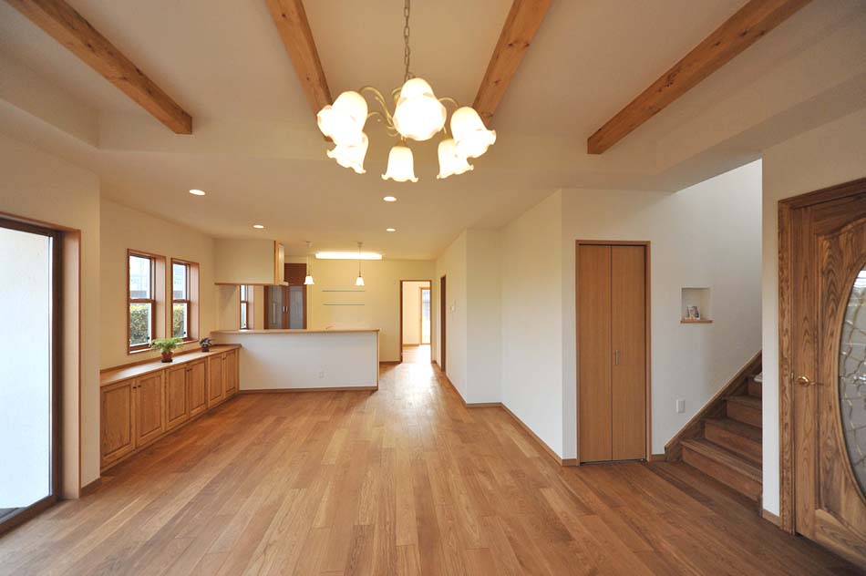 梁をあらわしにして、南欧の田舎風の味わいを演出しています。リビング入り口のドアなど至る所にステンドグラスも配置されています。
