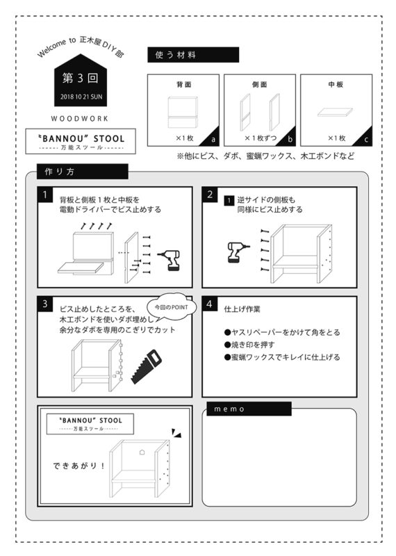 第3回正木屋DIY「万能スツールづくり」を10月21日(日)に開催しました。