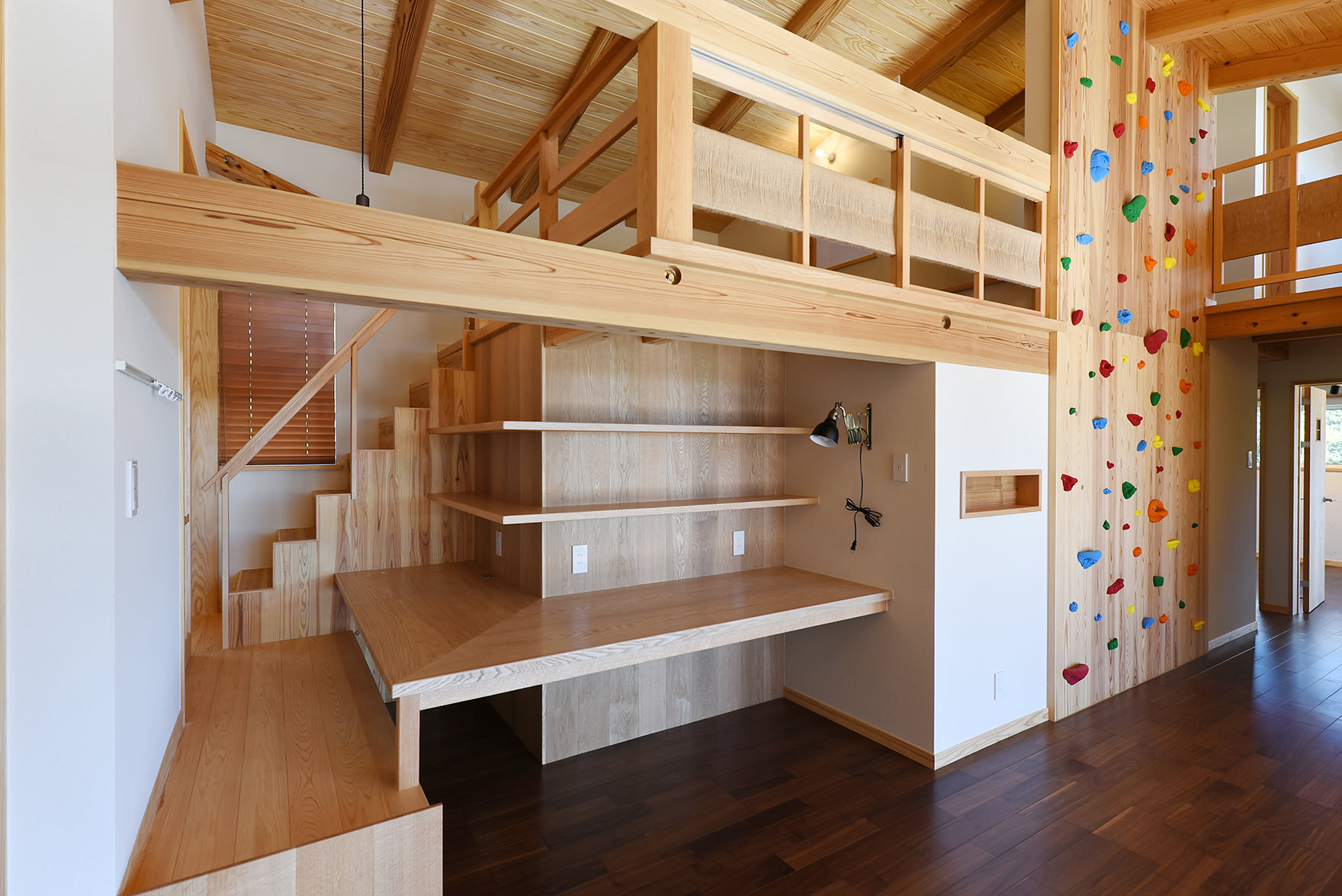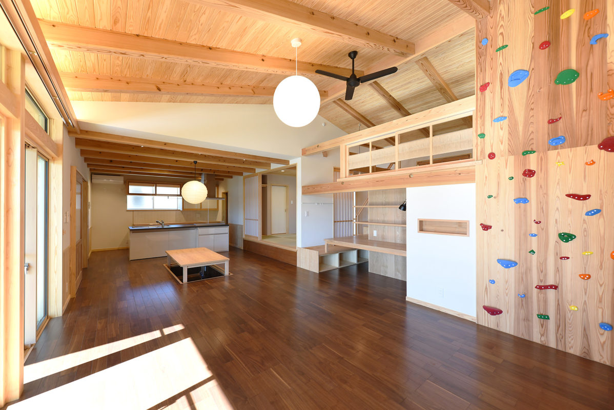 階段が2ヶ所あったり、ボルダリングで2階まで行けたり、ロフトや抜け道など子どもたちが縦横無尽に家の中を遊び回れる様々な工夫がされたリビングダイニング。
