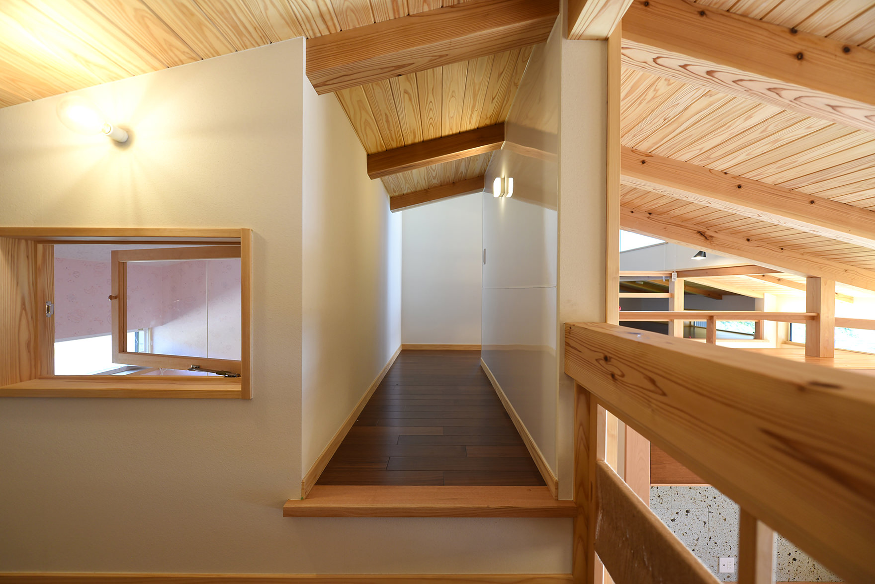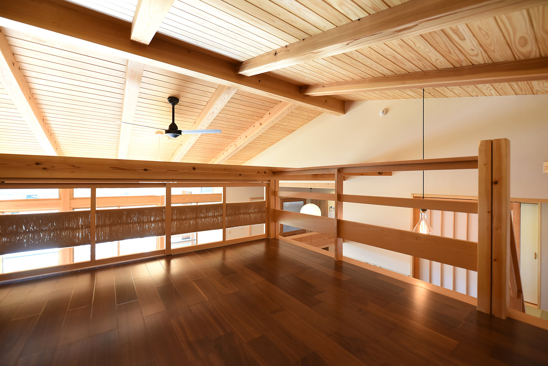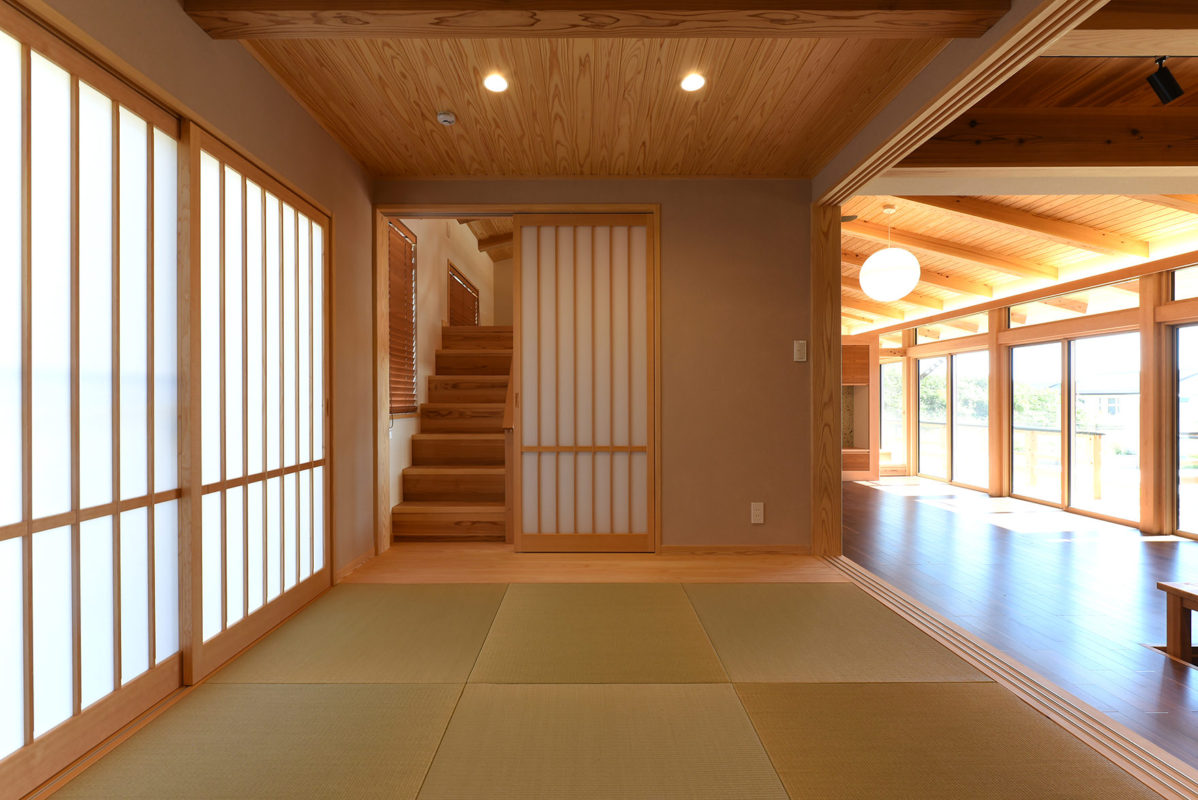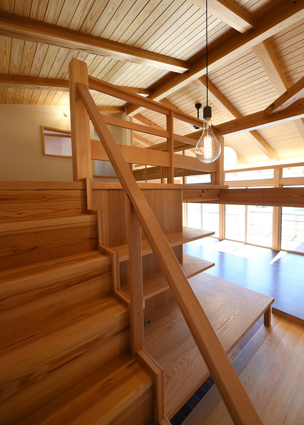 和室階段からリビング方向。集魚灯と木構造が美しい。