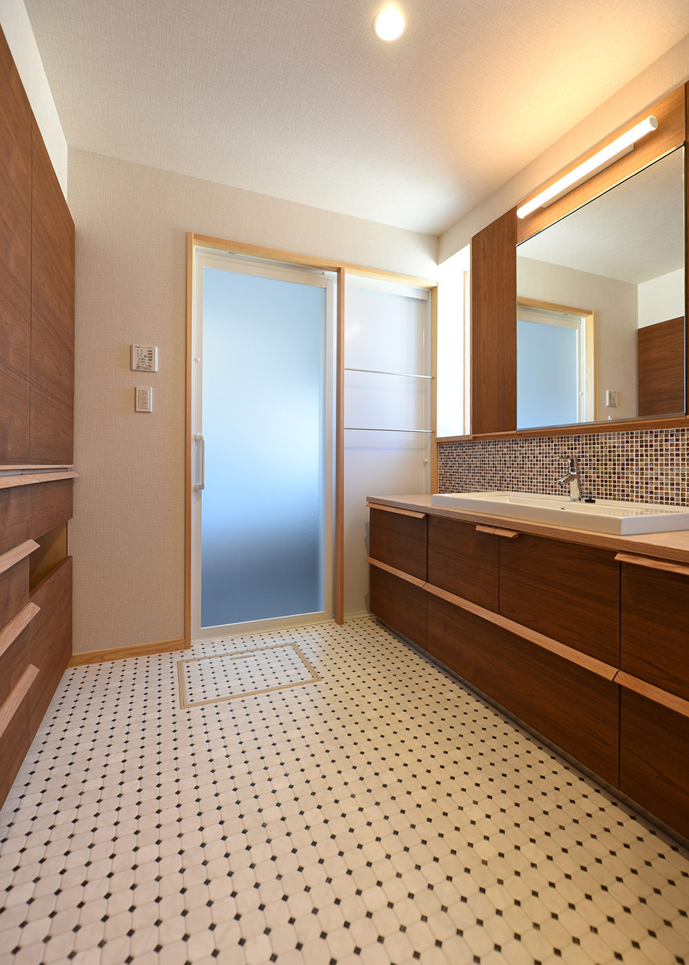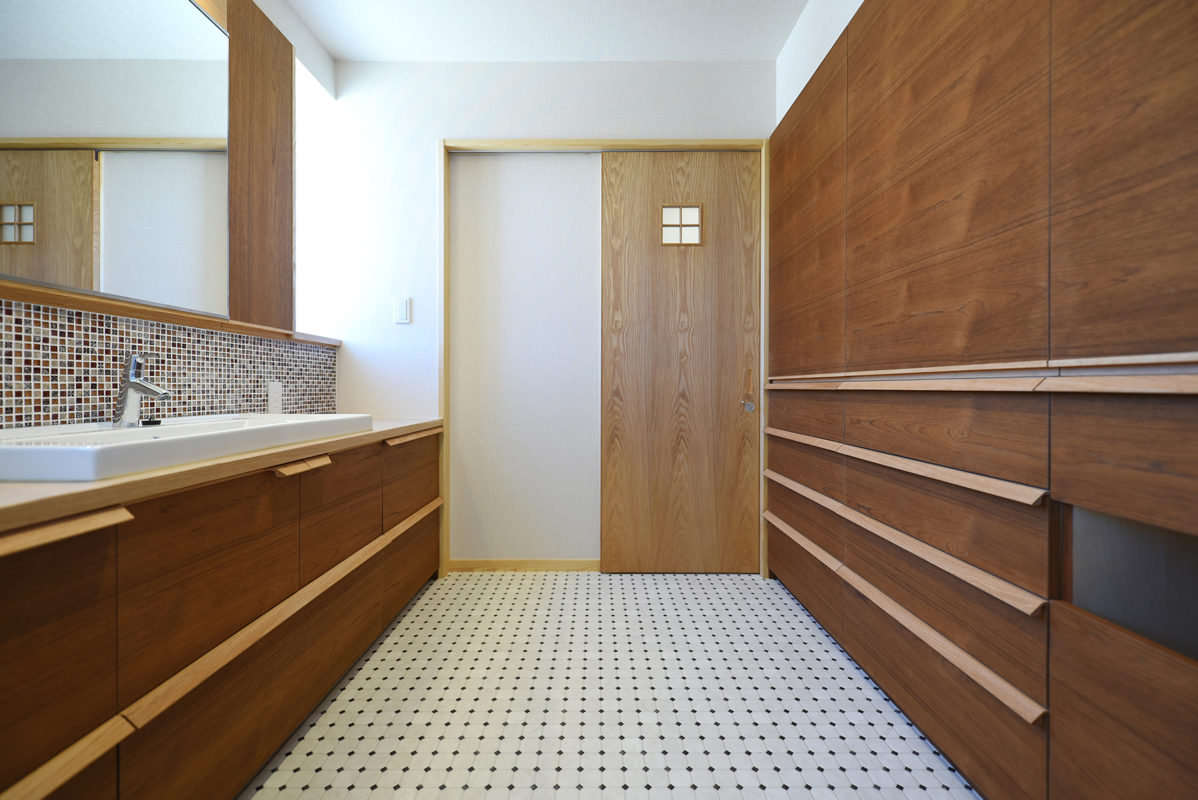 巾1.8mの大容量の造り付け収納のある洗面脱衣室。