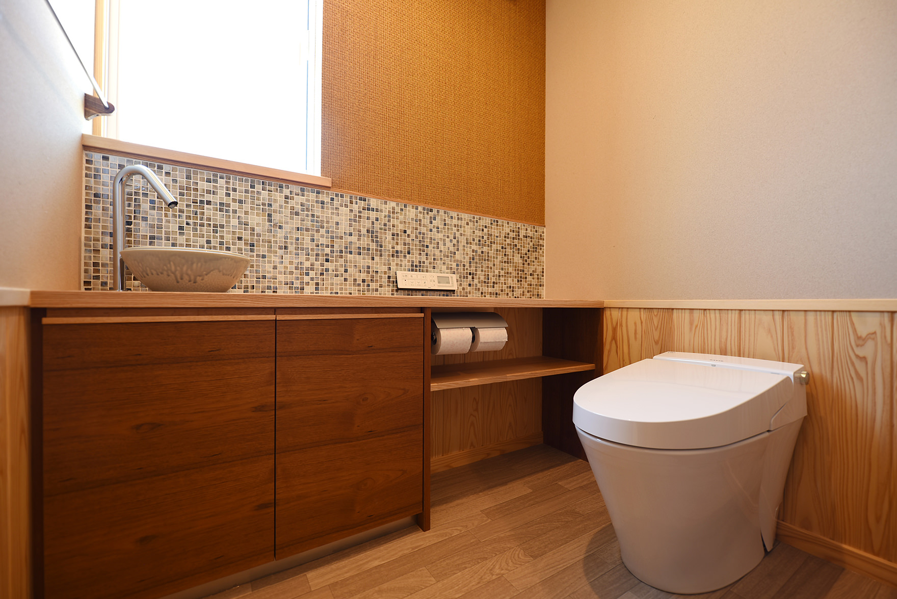 化粧の構造材は福島県の杉材、断熱も高性能サッシ、壁に20k120mmのグラススール、天井に300mmのグラスウール吹き込みを使用した高気密高断熱住宅になっています。(床暖房完備)
