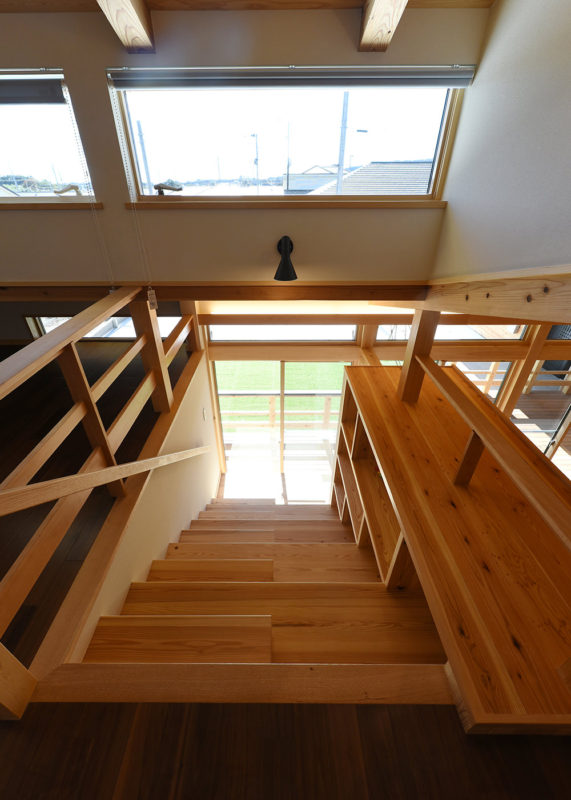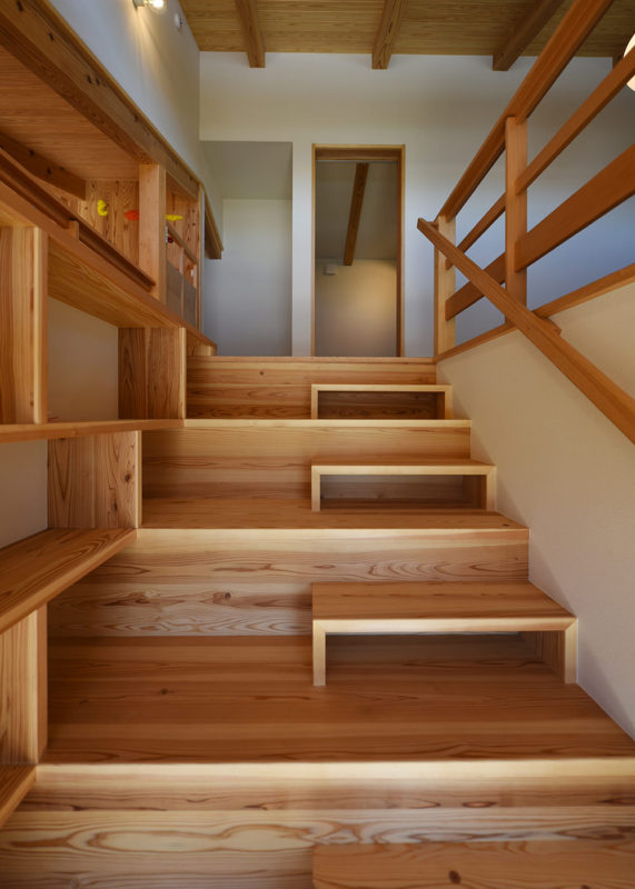 一部分2階建てになっていますが、軒を1800mm出して高さを抑え、平屋の雰囲気を大事にしました。内部は子供が1階から2階をぐるぐると回れるように階段を2ヶ所設け、登ったり、走ったり、落書きしたり遊べる場所、本を読んだり勉強する場所、高いところに低いところなど、いろんな居場所をつくるようにしました。また、どこで遊んでいても親の目が届き、会話ができるように大きなつながった空間にしました。