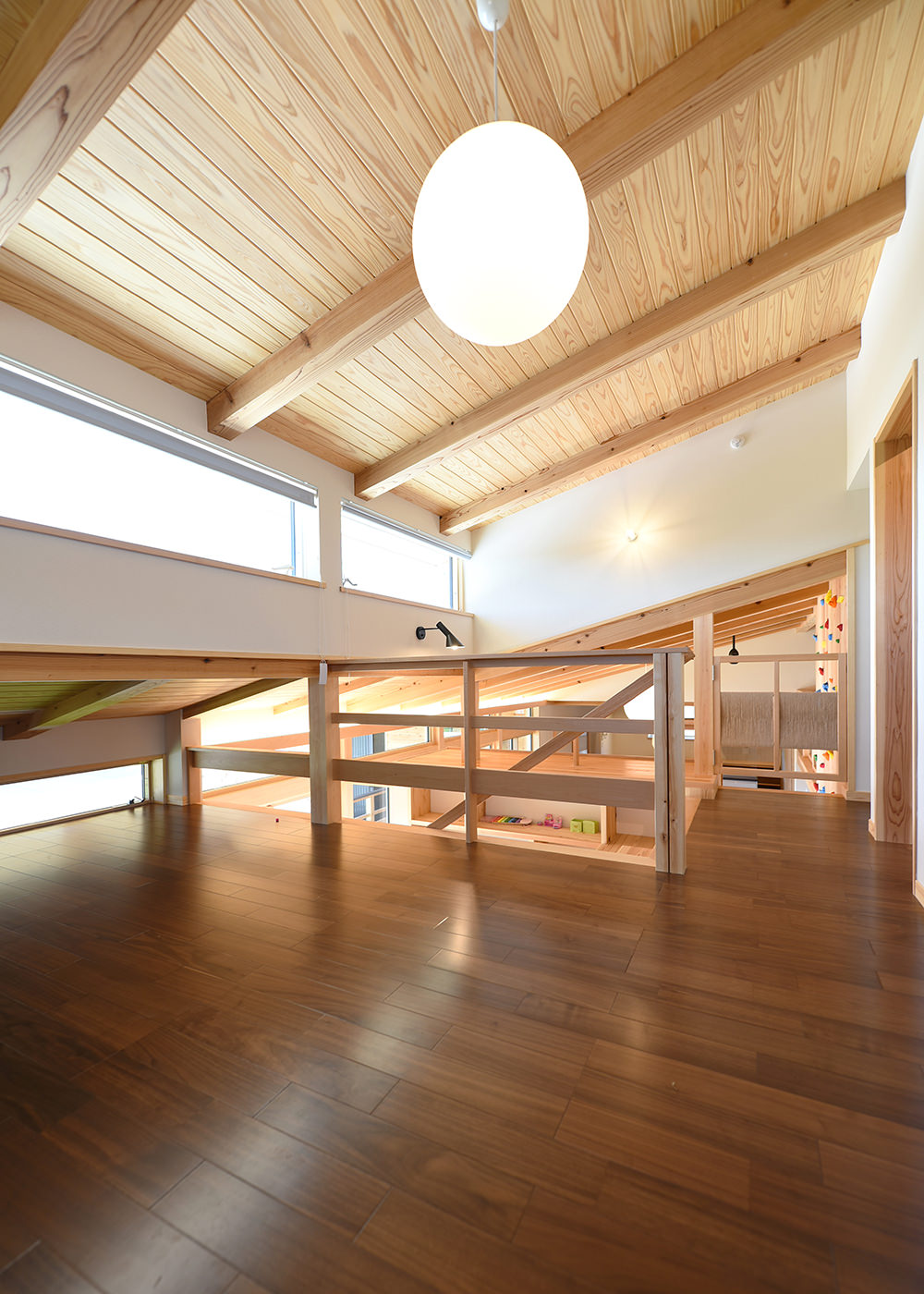 抜け道を通って2階のフリースペースへ。屋根の勾配を利用した高低差が遊びを広げます。