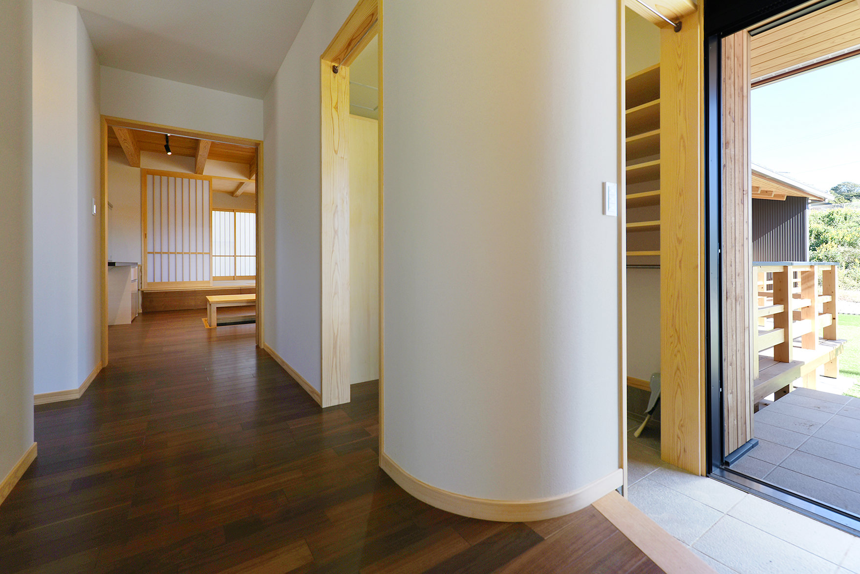 玄関を入るとアール状の柱がプライベートとパブリックを分けます。プライベートスペースには5人の子供それぞれに収納スペースが振り分けられています。