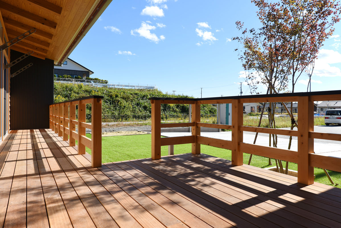 耐候性のあるセランガンバツ材のデッキ。庭を眺めながらのバーベキューが楽しみだそうです。