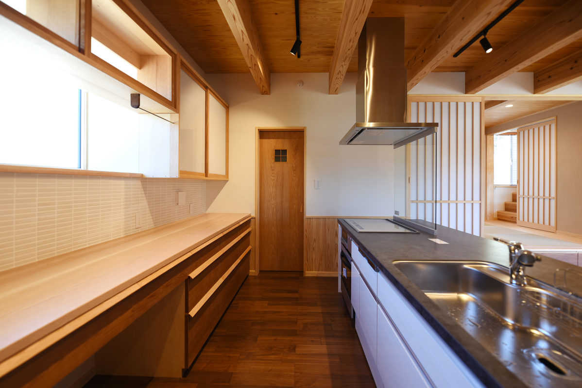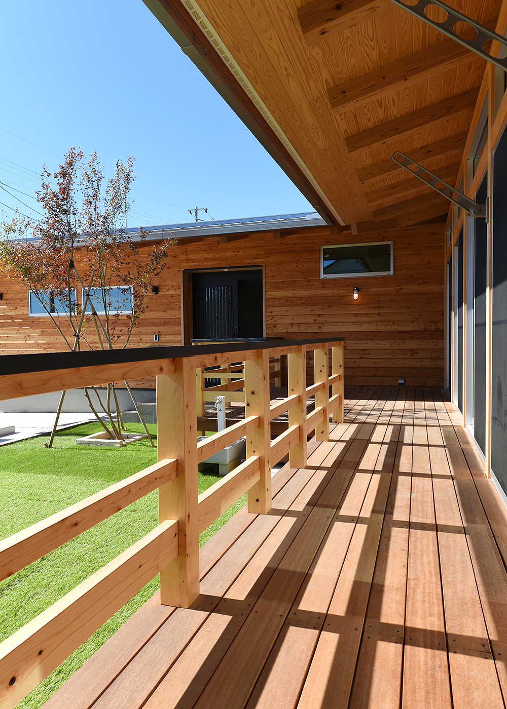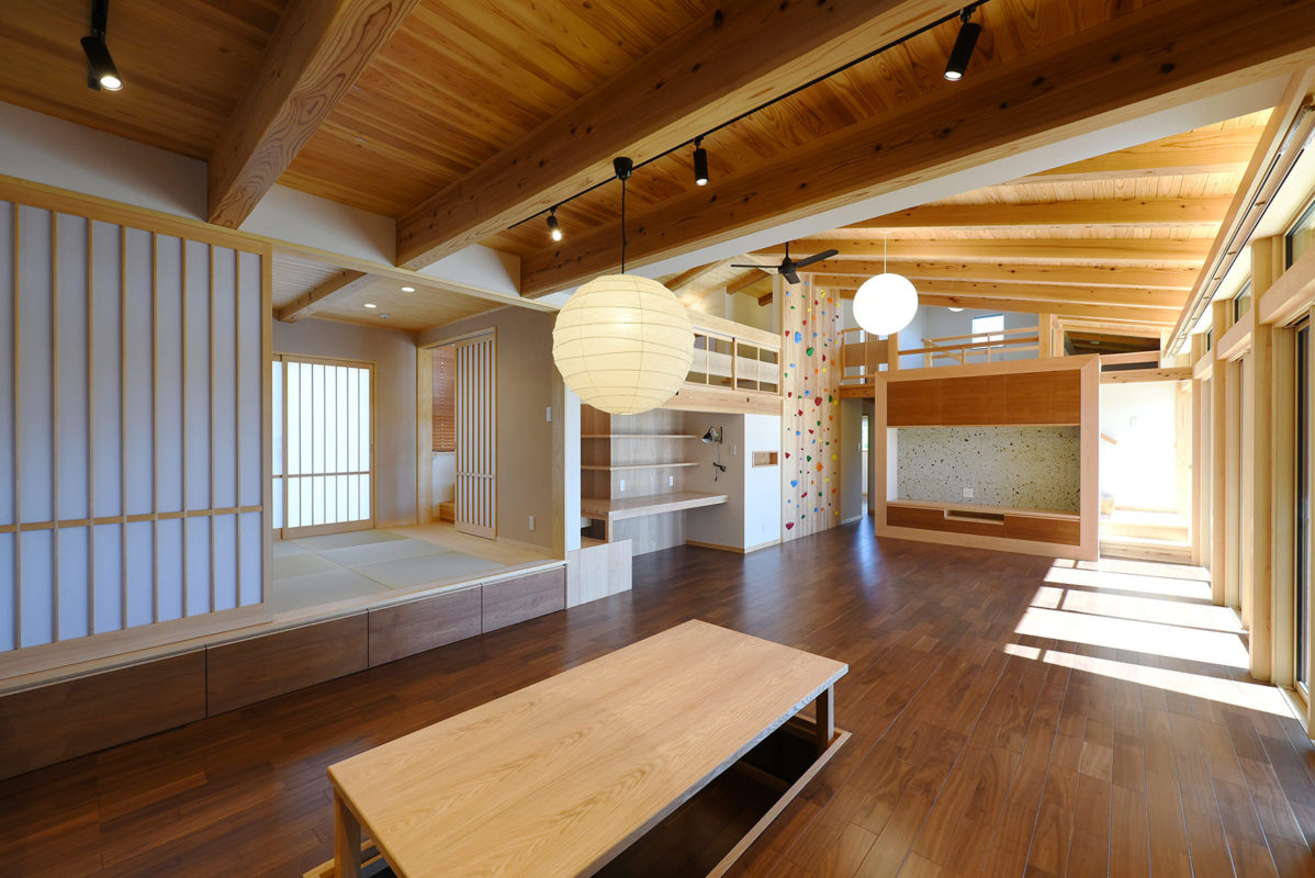 お子さん5人が家の中でものびのび遊べることと、できるだけ平屋がいいという建主さんの依頼に、一部2階建てのプランを提案。軒を深く出すことと、2階建て部分の1階と2階の天井高を低く設定して、外観からは平屋のような佇まいです。