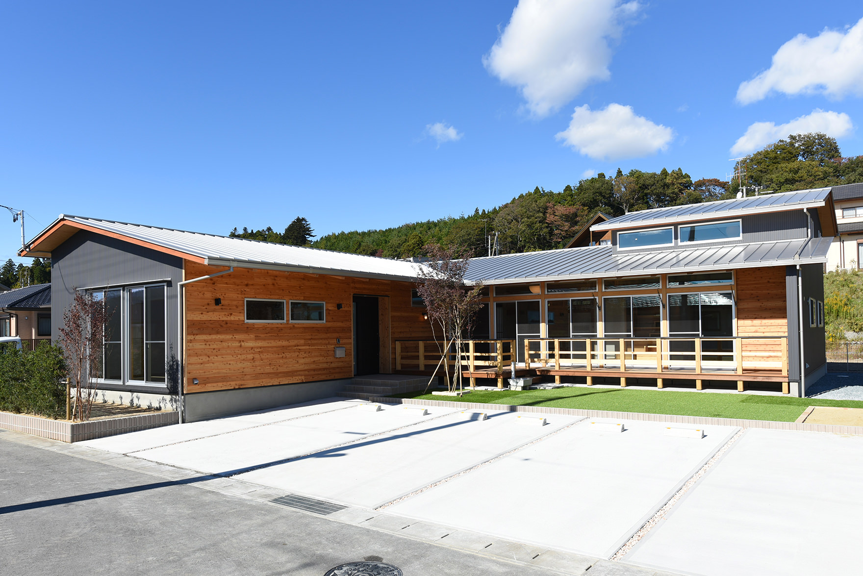 敷地は住宅地の一番端で東側がオープンスペースになっているので、東側に広がるようなL字のプランとして庭が大きく感じるようにしました。