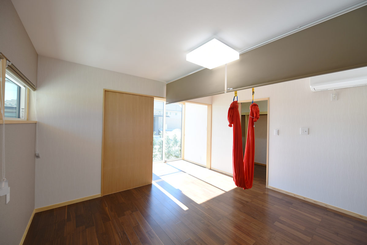 1階主寝室は多目的。エアリアルヨガ、洗濯物干し縁側、ウォークインクローゼットなど。