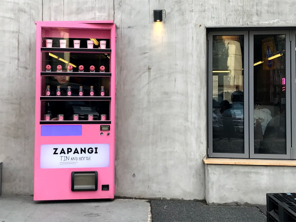 超インスタ映え!個人経営の出店が相次いでいる注目エリア「望遠洞(マンウォンドウ)」の中でも、店の前で写メを撮る若者で溢れているのはこの店がダントツ1位。ピンクの自動販売機が、入口のドアなので。アイディア!
