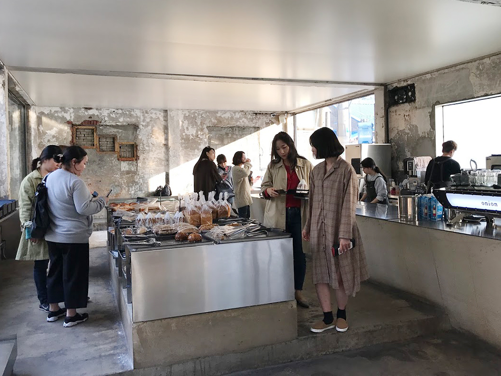 工場や倉庫が集まる工業地帯だったエリアに、クリエイターやおしゃれなカフェやレストランが進出し、若者が足を運ぶ場所になったエリア「聖水洞(ソンスドン)」。ソウルのブルックリン!とも呼ばれるこのエリアで、café onionは必ず名前があがるスポット。寒々しいぐらいコンクリートやレンガがむきだしだが、それがまたかっこよく味がある。工場だった建物をそのまま生かした空間が若者に大人気。迷路のような建物は、テラス席もありかくれんぼができそうなぐらい広い。テラスのある2階では人気のパン屋「BREAD05」が。