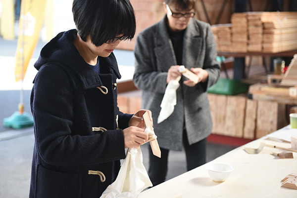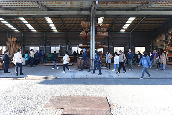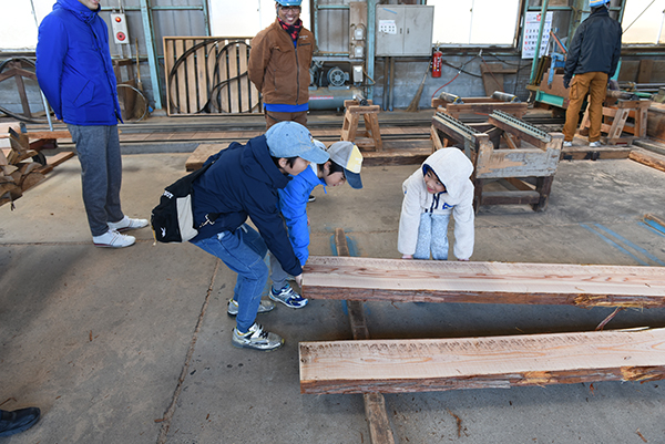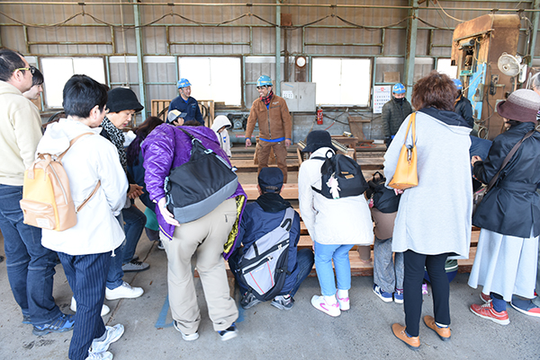 午後からは県主催の「木めぐりツアー」ご一行様が来社。このツアーでは平木材市場、モデルハウス見学(後田工務所様)、そして最後に弊社で工場見学&木工体験です。