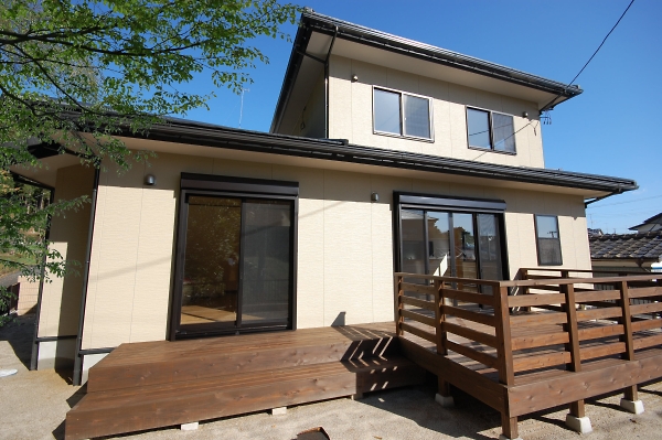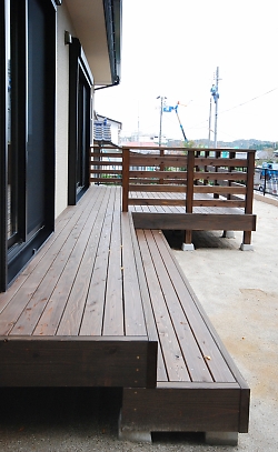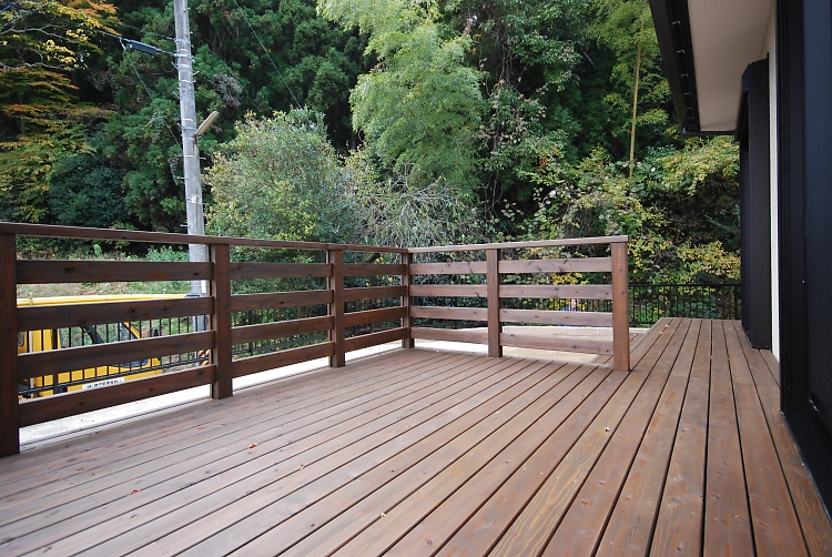 LDKとつながる大きなウッドデッキ。地産の杉に無害な防腐加工をした「ガーデン杉」を使用しました。少し高台になっているのと、西側の林を借景に別荘感覚のデッキになりました。