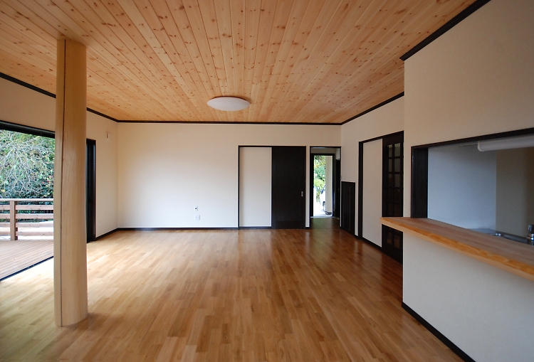 特に1階は広い部屋が欲しいという要望に応えて、24帖のLDKです。構造上必要だった大黒柱は配置を工夫し、この家のシンボルとなるようにしました。周囲の豊かな自然環境に馴染むよう、天井にもレッドパインの羽目板を使うなど、ふんだんに木材を使っています。