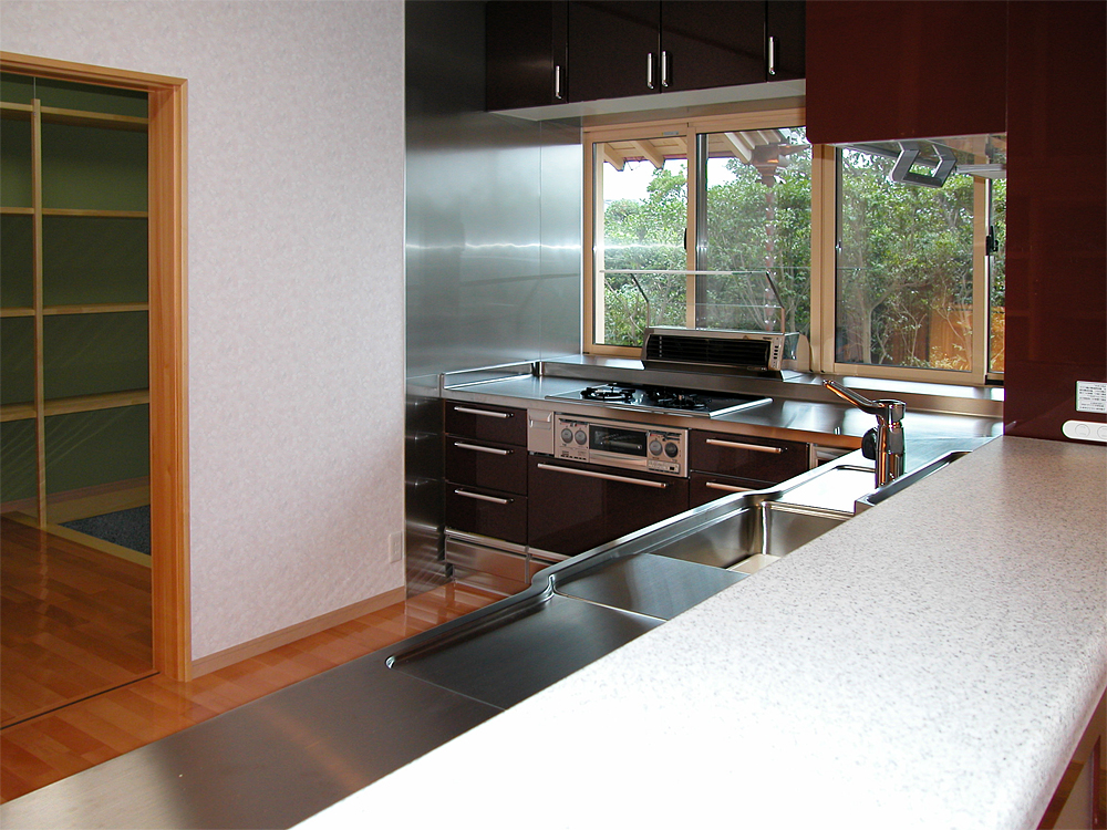 クリナップのL字型のキッチンとダイニング。3600×2700+出窓まで一体形成の特注品です。換気扇はドイツ製で庭への視界を遮らない物を選びました。
