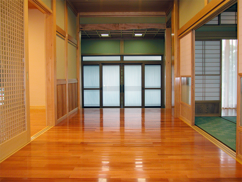 主な内部仕上:天井)杉無垢、桜突板、ケヤキ格天井 建具)秋田杉、襖紙)手すき和紙 床)サクラフローリング、御殿表畳