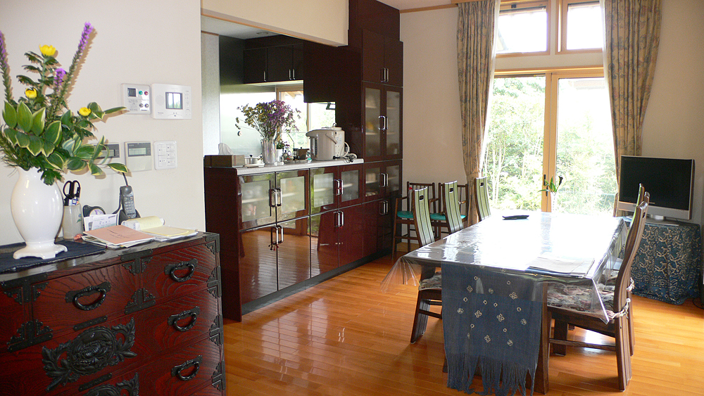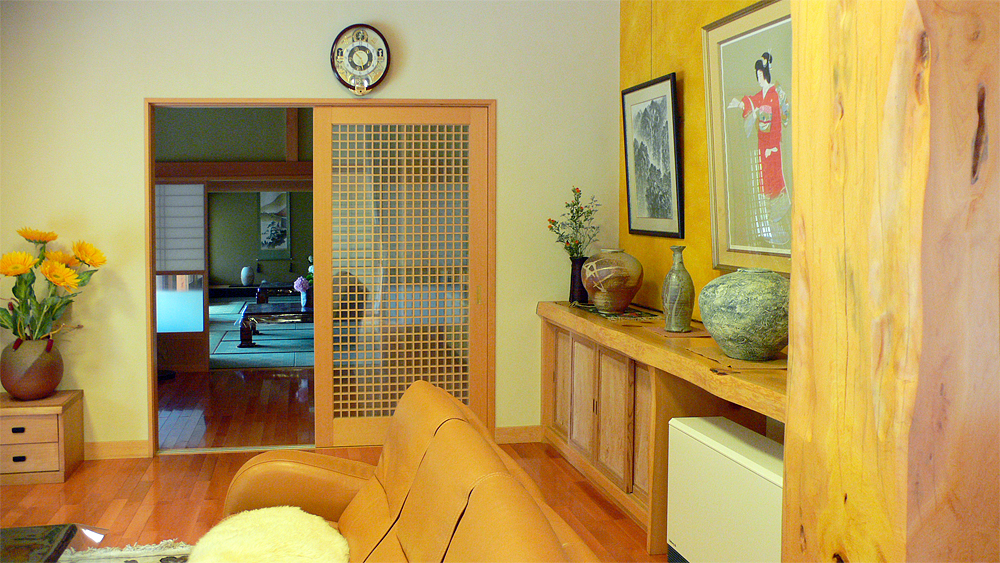 28リビングから和室方面を見たところ。飾り棚は備州桧。柱はカヤで尺3寸(約40センチ角)あります。フローリングはサクラの無垢板。天井高は3mで、正面の建具も造り付けです。