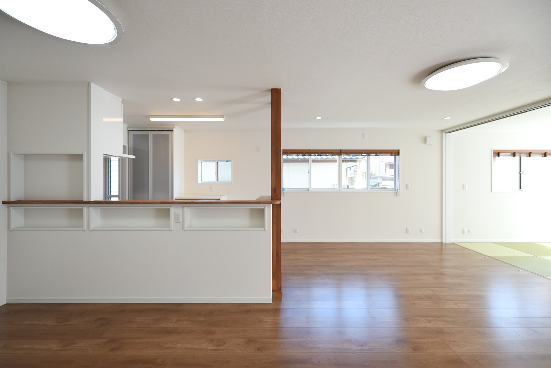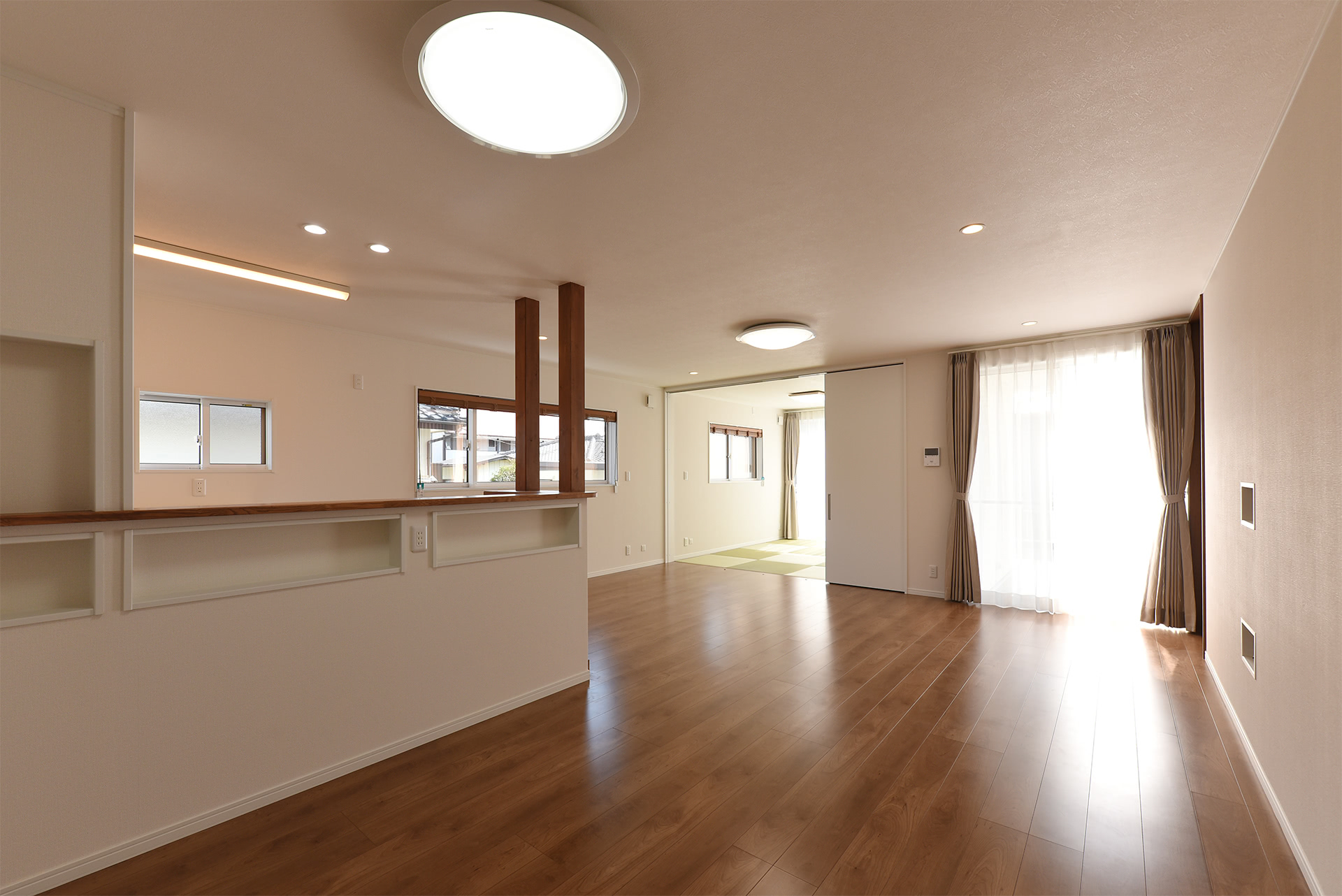南面の和室とつながるので奥行きと広さが感じられるLDK。子どもが和室で遊ぶ様子をキッチンから見守る事ができます。