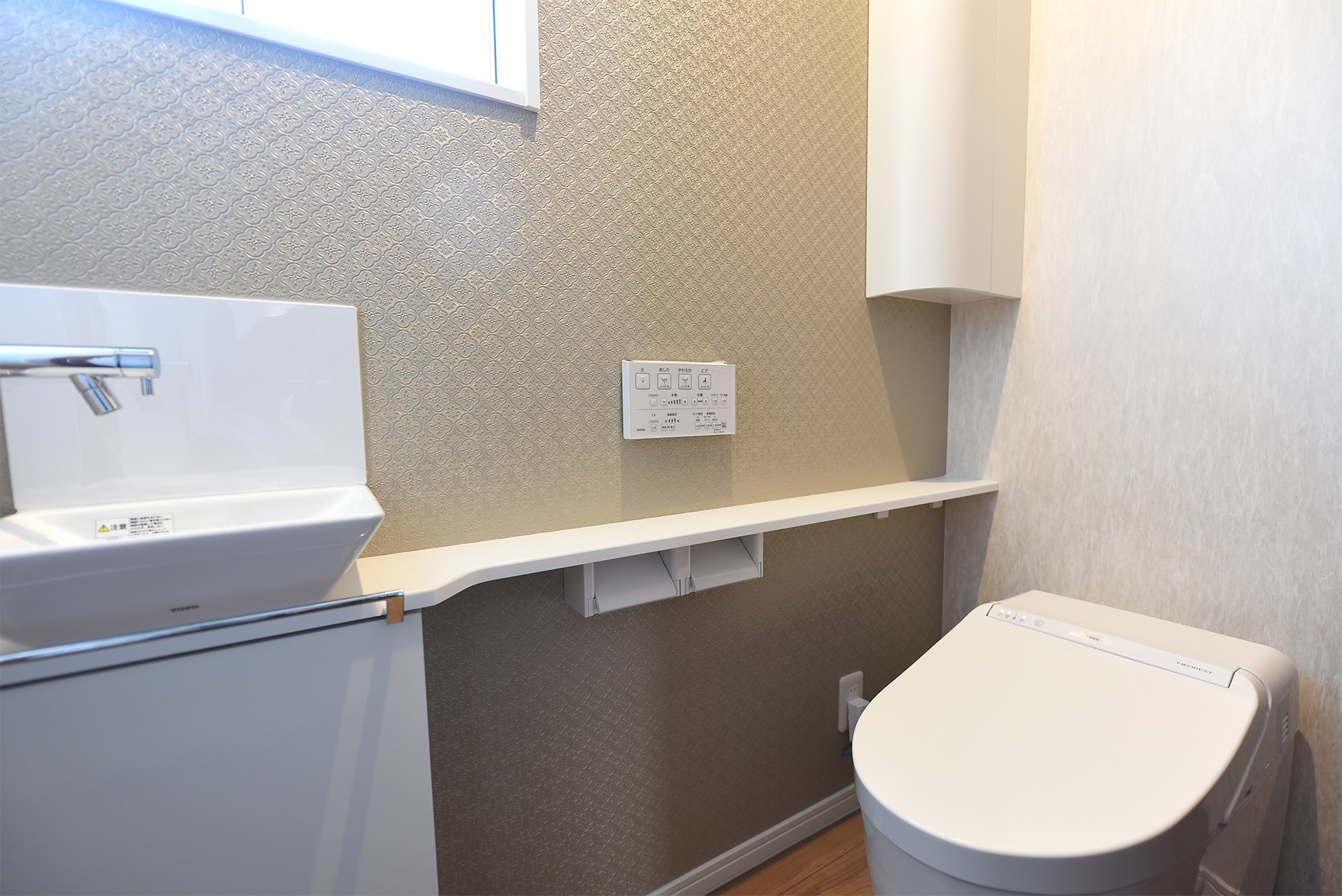 壁紙のエンボス質感が清潔感のあるトイレ。