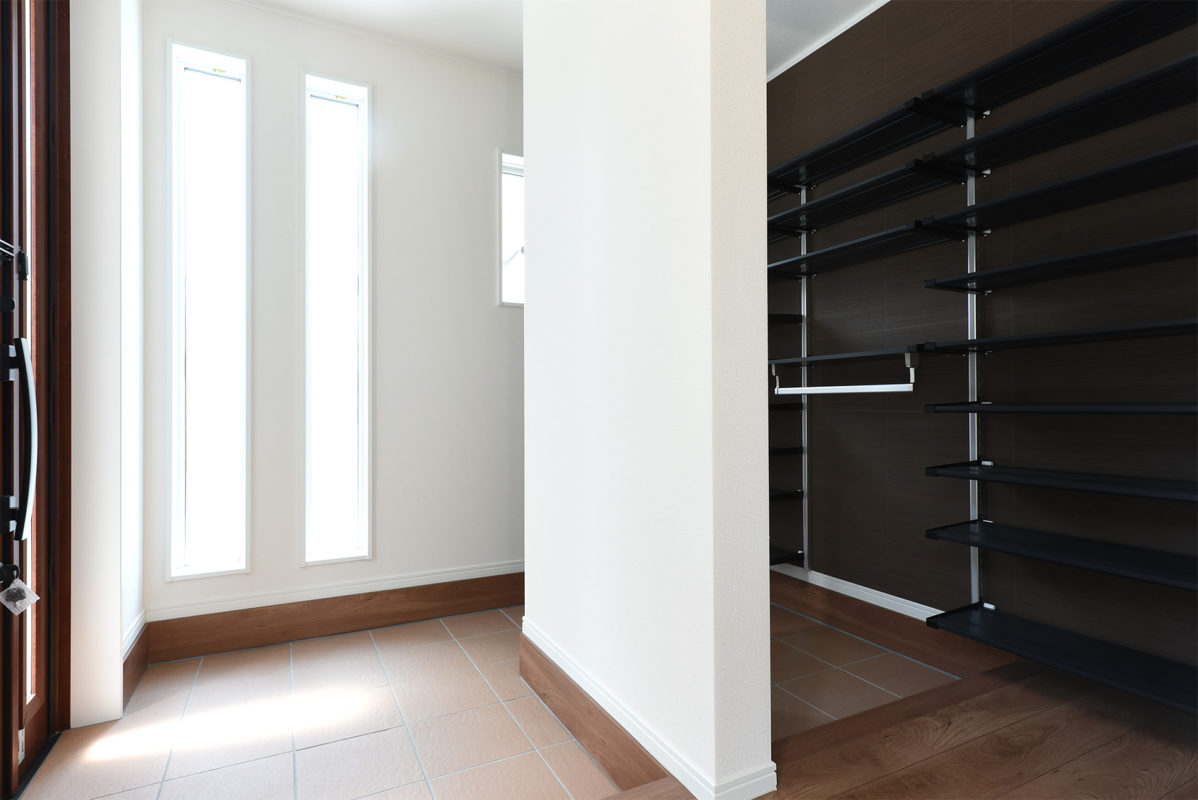 採光がたっぷり入る明るい玄関。来客用と家族用に分かれていて、家族用は収納力大。