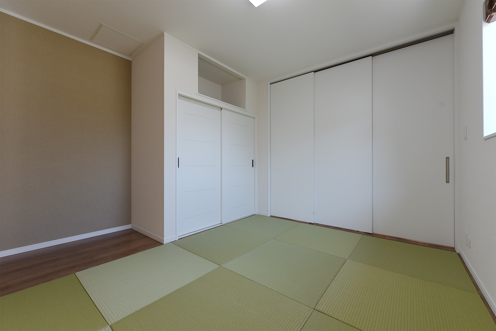 リビングとの相性を考えて、縁無しの置き畳と白い建具にした和室。