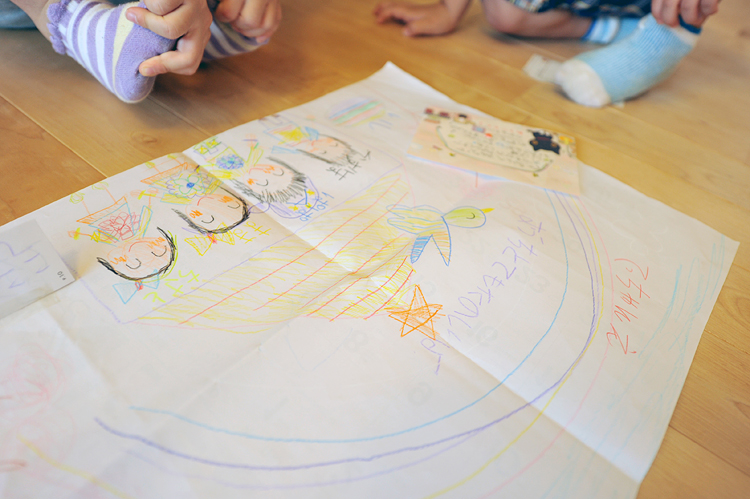 お子さん2人が描いてくれた「てっちゃんえ おうちとてもたのしいよ」の絵。うれしいですね。