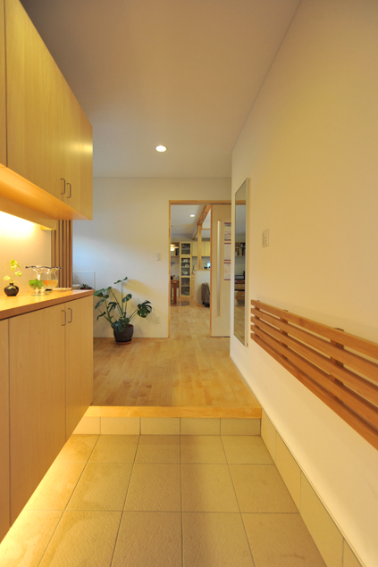 間接照明を生かした玄関。右側はどこでもつかめる手すりです。玄関の左脇には帰ってすぐ手洗いできるコーナー。