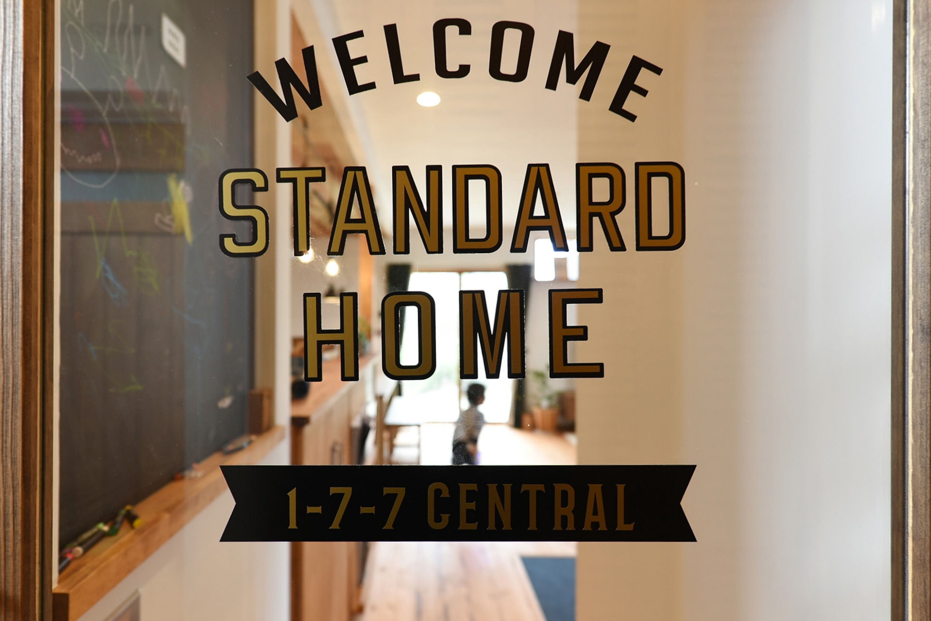 リビングドアのガラスにウェルカムサインでお出迎え。