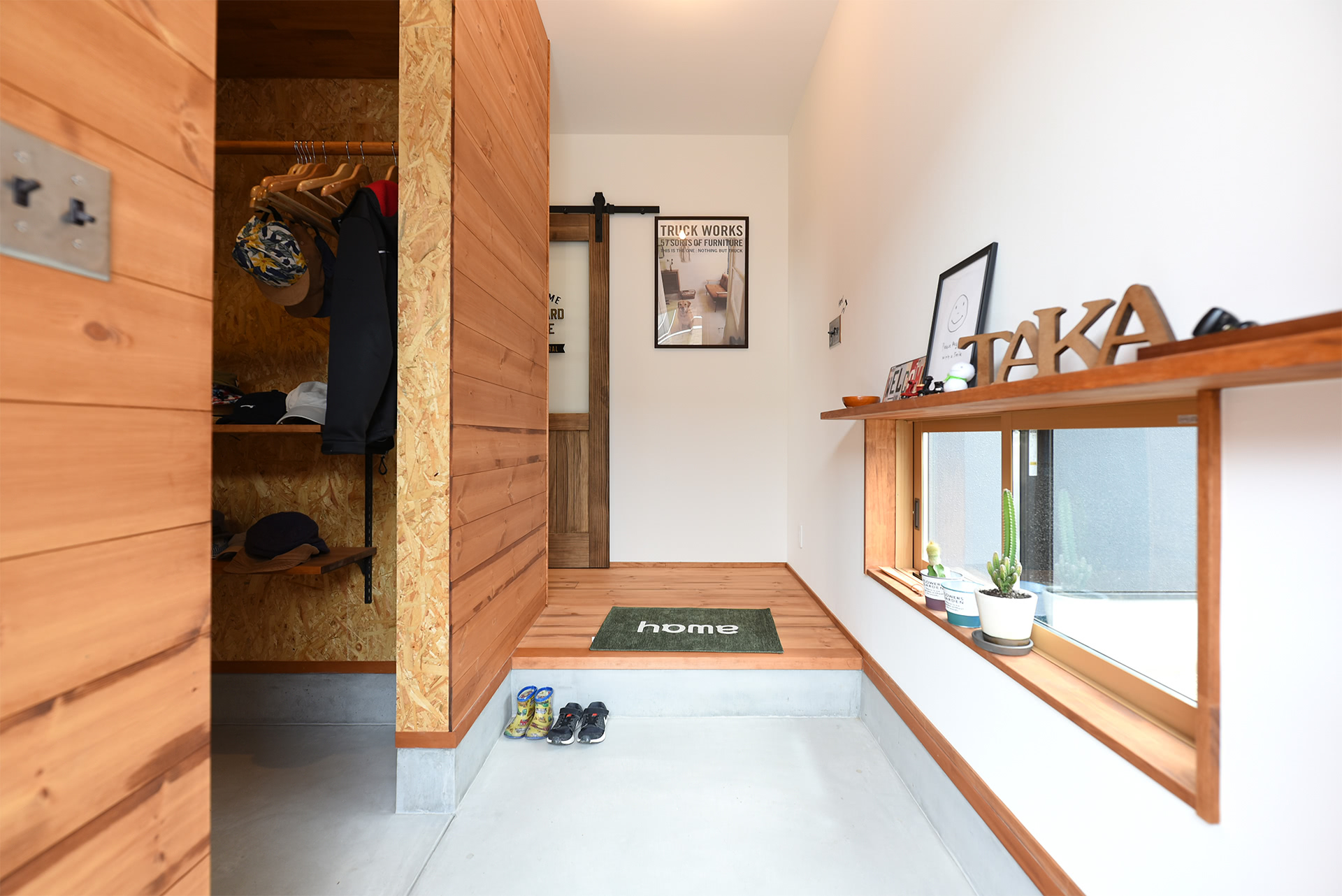 モルタル仕上げの玄関。下窓から明かりを取り入れます。
